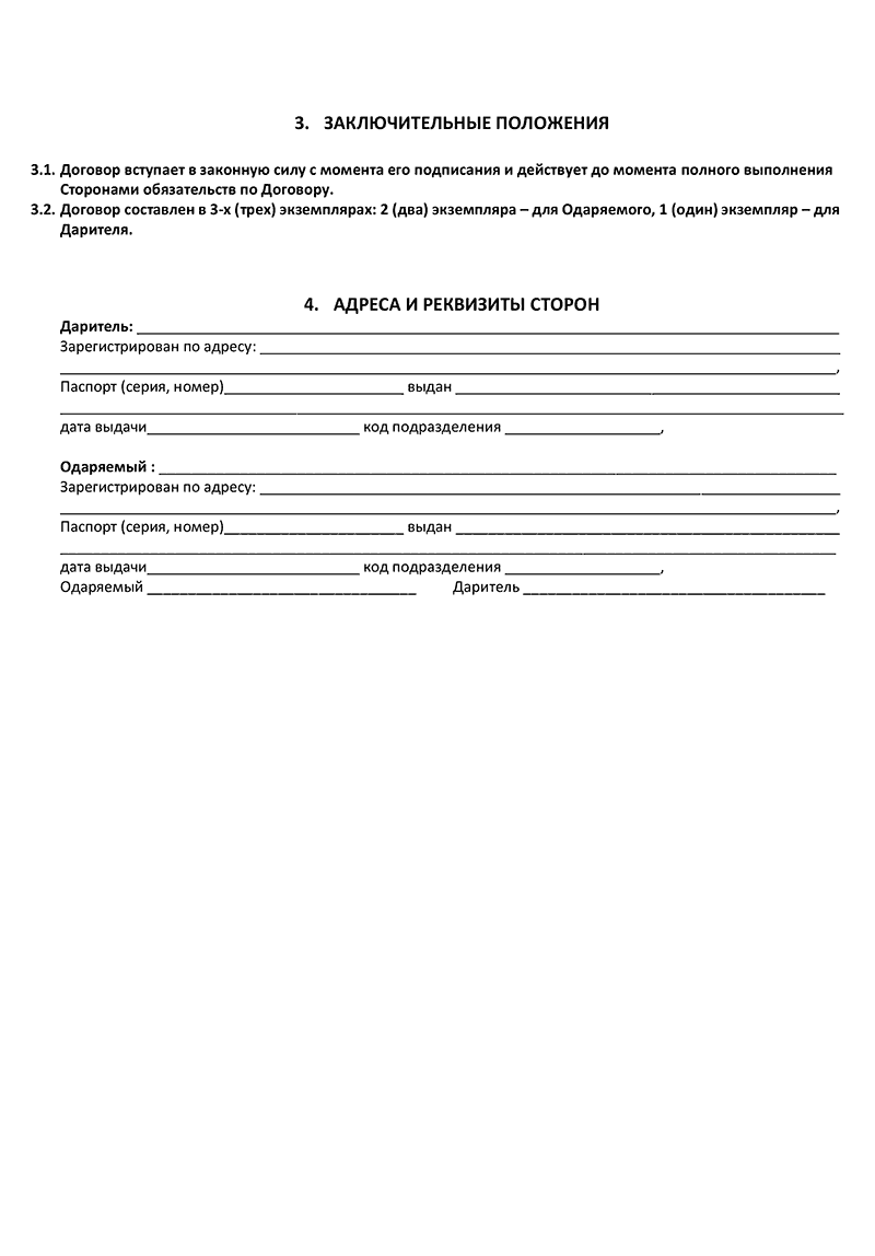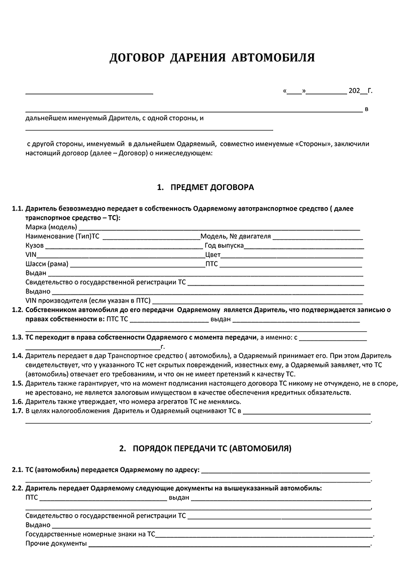 - Описание транспортного средства, которое перейдёт в собственность одаряемого после подписания договора.
