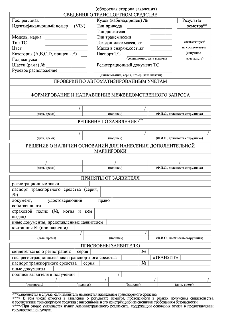 Такая процедура закреплена нормою п.56 Правил и предусматривает два варианта оформления. В первом случае заявление подает владелец ТС при отсутствии перехода права собственности на авто. Для этого в ГИБДД подается: